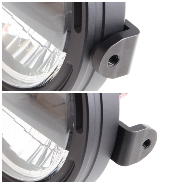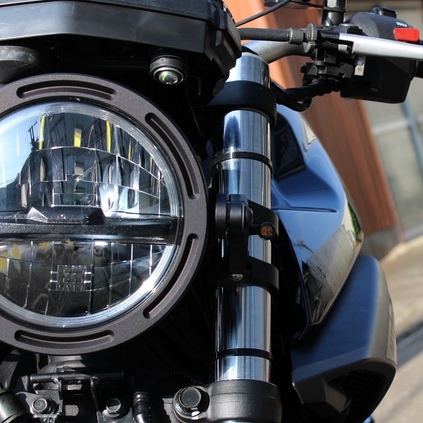 フォークの間にヘッドライトを可能な限り近づけるため、1センチ単位で設計を追求しました。安全性を前提に開発されたアルミ製マウントリングは、LEDヘッドライトレンズユニットと一体で提供され、バイクへの装着を自由に、そして確実に実現します。
