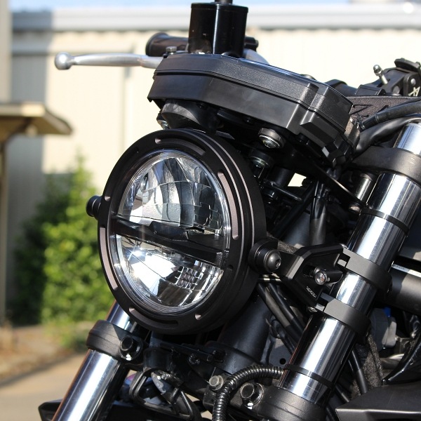 | ハイパワーLEDが可能にした薄型レンズはストリートカスタム、ネオカフェレーサーカスタムにマッチし、ヘッドライトの飛び出しを抑えてくれます。 またライトは二輪で使用する想定範囲での防水性があります。 | |