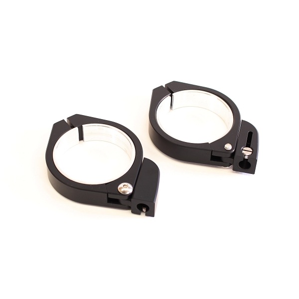 高さ15mmの分割式フォーククランプとウインカーを収めるホルダーから構成され、キットにはそれぞれのフロントフォーク径に対応したアルミスペーサーカラーが付属、正立フォーク・倒立フォークを問わず取り付けが出来、ランナップ外のフロントフォーク径でもアルミスペーサーや樹脂スペーサー、ラバーマット等でクランプ径を調整して取り付けることも可能です。