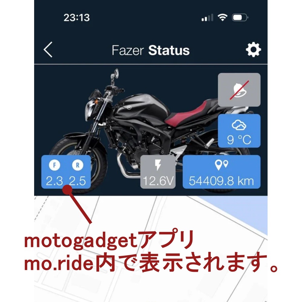 スマートフォンからタイヤ空気圧を読み取り、空気圧が下がるとヘルメットのヘッドセット、スマートウォッチ、スマートフォンに通知が届きます。このセットには2つのセンサーが含まれており、タイヤ空気圧を常時測定するため、より高い安全性が確保されます。データはBluetooth経由で無料のmo.rideアプリに送信。タイヤ空気圧が個別に設定された基準値から逸脱すると、すぐにアプリが警告を発します。