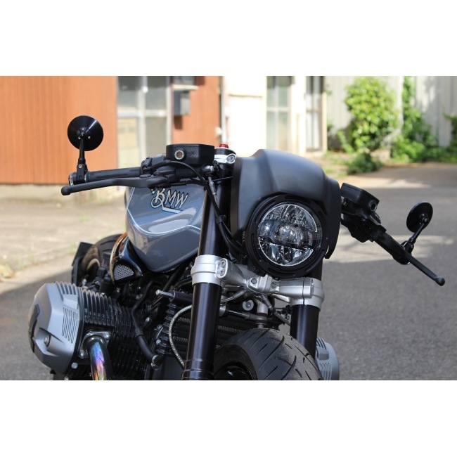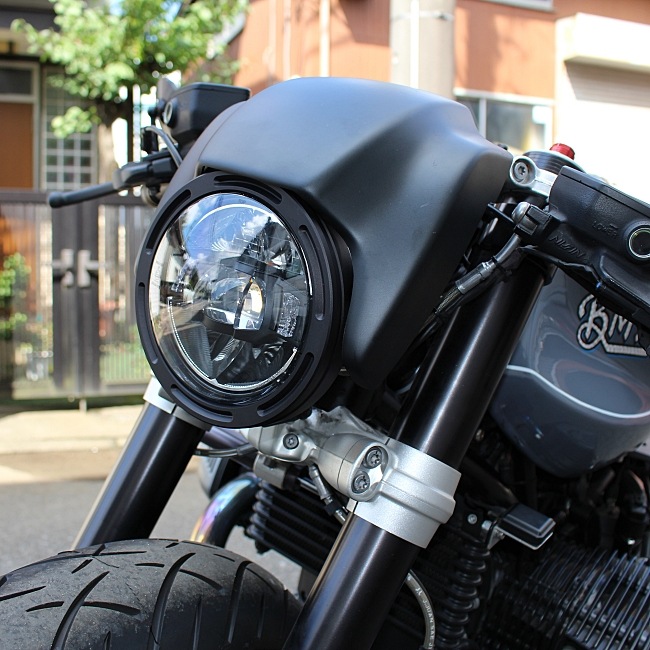 | LEDヘッドライトの収まるアルミ削り出しのR2フレームリングの表面はブラストブラックアルマイトが施されます。 |