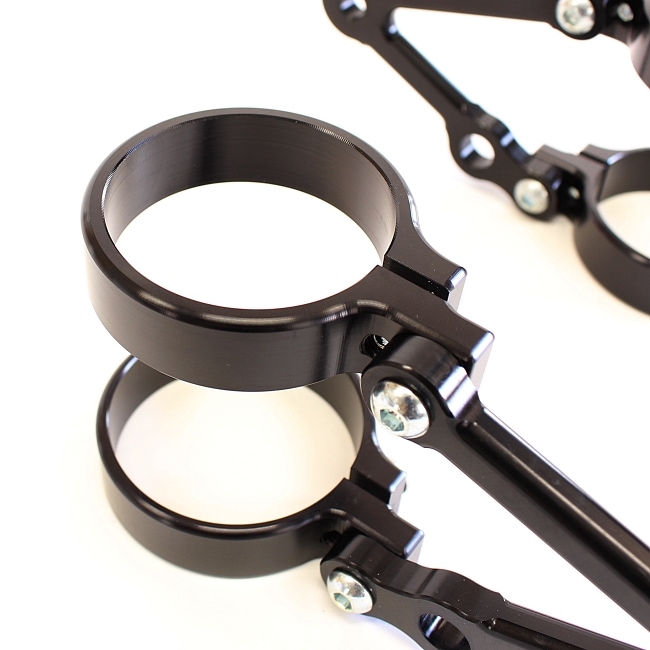 フォーククランプ、ステーともにアルミブロックから削り出されて作られた高品質ヘッドライトブラケット。