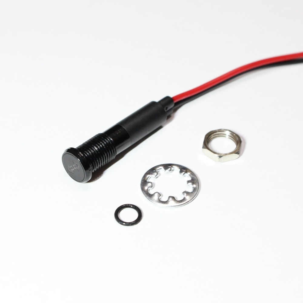 左右ウインカーの作動を一つのシンボルで表示するタイプで、メーター周りの省スペース化にも貢献します。最大直径10mm、長さ34mmのコンパクト設計で、取付穴径8mm・取付厚7mmまで対応しており、DIYでの取り付けもスムーズです。