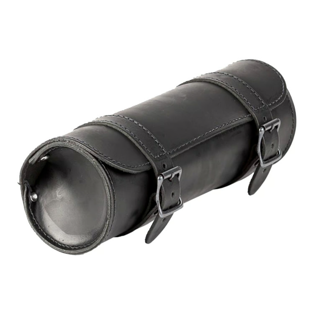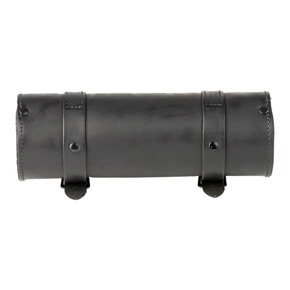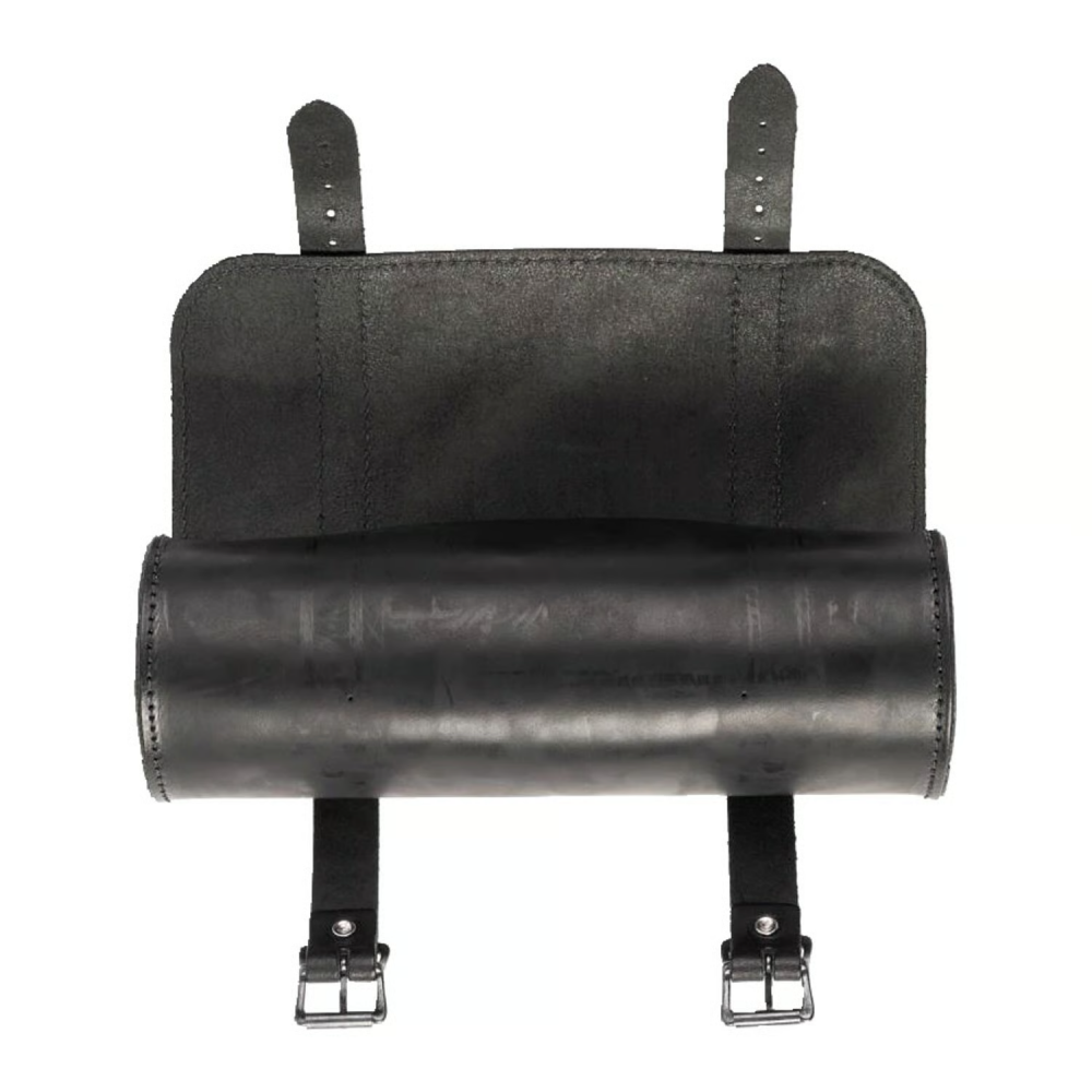 Ledrie製レザーツールロール(ブラック/ブラックバックル)。付属のレザーストラップで車体に取り付けできる汎用タイプです。容量は約1リットルで、必要な工具をスマートに収納可能。サイズは幅約30cm、直径約11cm。ツーリング時の携帯工具入れとして、クラシックからカスタム車まで幅広くマッチします。
