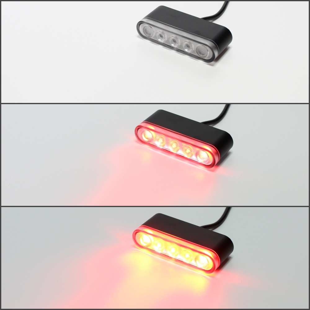テール(赤)・ブレーキ(赤高輝度)・ナンバー灯(白)を1つにまとめた3機能一体型で、 フェンダーレス化やリア周りのスリム化に最適です。
